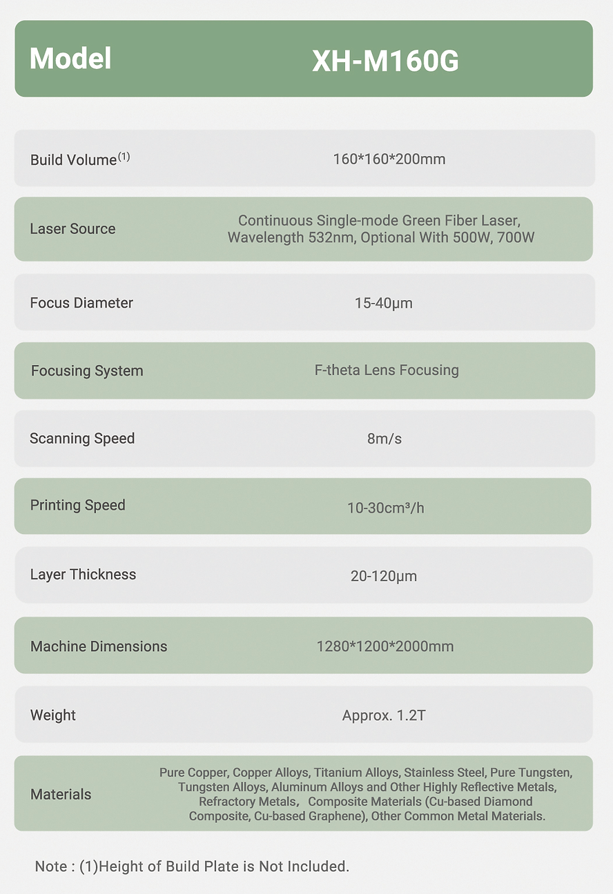 M160G는 1600*1600*2000mm의 작은 설치 공간을 갖춘 소형 산업용 금속 레이저 프린팅 시스템으로, 순수 구리 및 구리 합금 프린팅용으로 설계되었습니다. 532nm 파장을 가진 업계 최초의 산업용 그린 레이저 중 하나로, 고굴절 금속 분말 가공에 적합합니다.